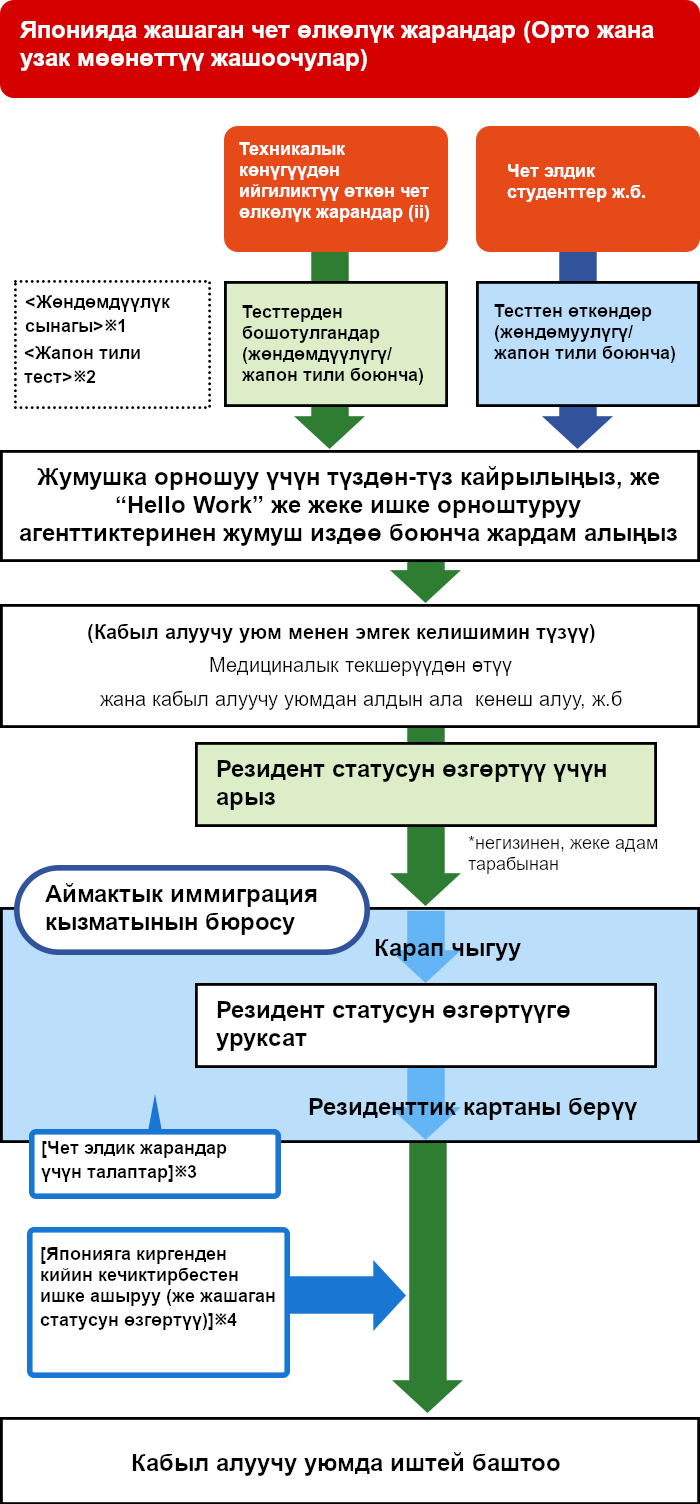 Японияда АКЖ катары иштөөнүн жалпы процесси төмөнкүдөй.(төмөнкү блок-схема АКЖ(ⅰ)-дин түшүндүрмөсү болуп саналат.)Бирок, жол-жоболор өлкөгө жараша бир аз айырмаланарын жана кээ бир өлкөлөрдүн өздөрүнүн ички процедуралары бар экенин эске алыңыз (чоо-жайын билүү үчүн Япониянын элчилигине же өз өлкөңүздөгү чет өлкөлүк жумушчуларды жөнөтүү органына кайрылыңыз).
